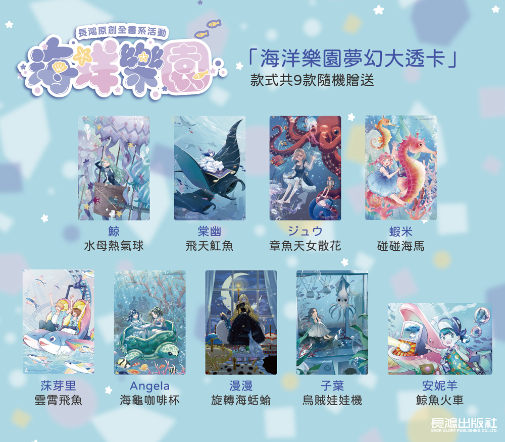 2025年即將進入尾聲,為感謝讀者長期以來對長鴻出版社國人原創漫畫的支持與陪伴,長鴻特別策劃原創全書系滿額贈活動「海洋樂園」,並邀請九位原創創作者共同參與,以繽紛畫作獻上歲末驚喜。2025年11月6日(四)起,凡於指定店家或網路商城購買長鴻出版作品(不限小說、漫畫),消費滿169元即可獲得「海洋樂園夢幻大透卡」乙張,款式共9款隨機贈送。 (贈品數量有限,贈完為止。實際贈送方式依店家為主)