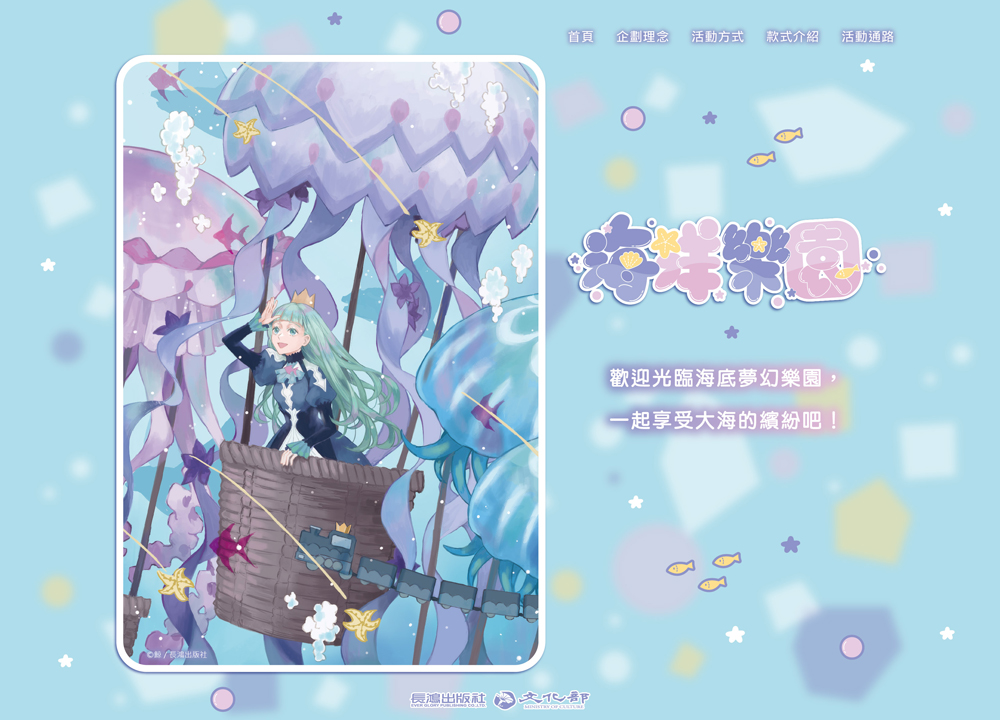 本次活動邀請繪畫風格細膩的鯨老師創作主視覺「水母熱氣球」,其豐富柔美的插圖在活動預告期間便吸引眾多讀者的目光。活動贈品「海洋樂園夢幻大透卡」以「海洋生物」×「遊樂園設施」為主題,將多采多姿的海底世界化為奇幻樂園,邀請大家與長鴻一同走進深海夢鄉般的樂園,探索大海的絢麗與驚奇!