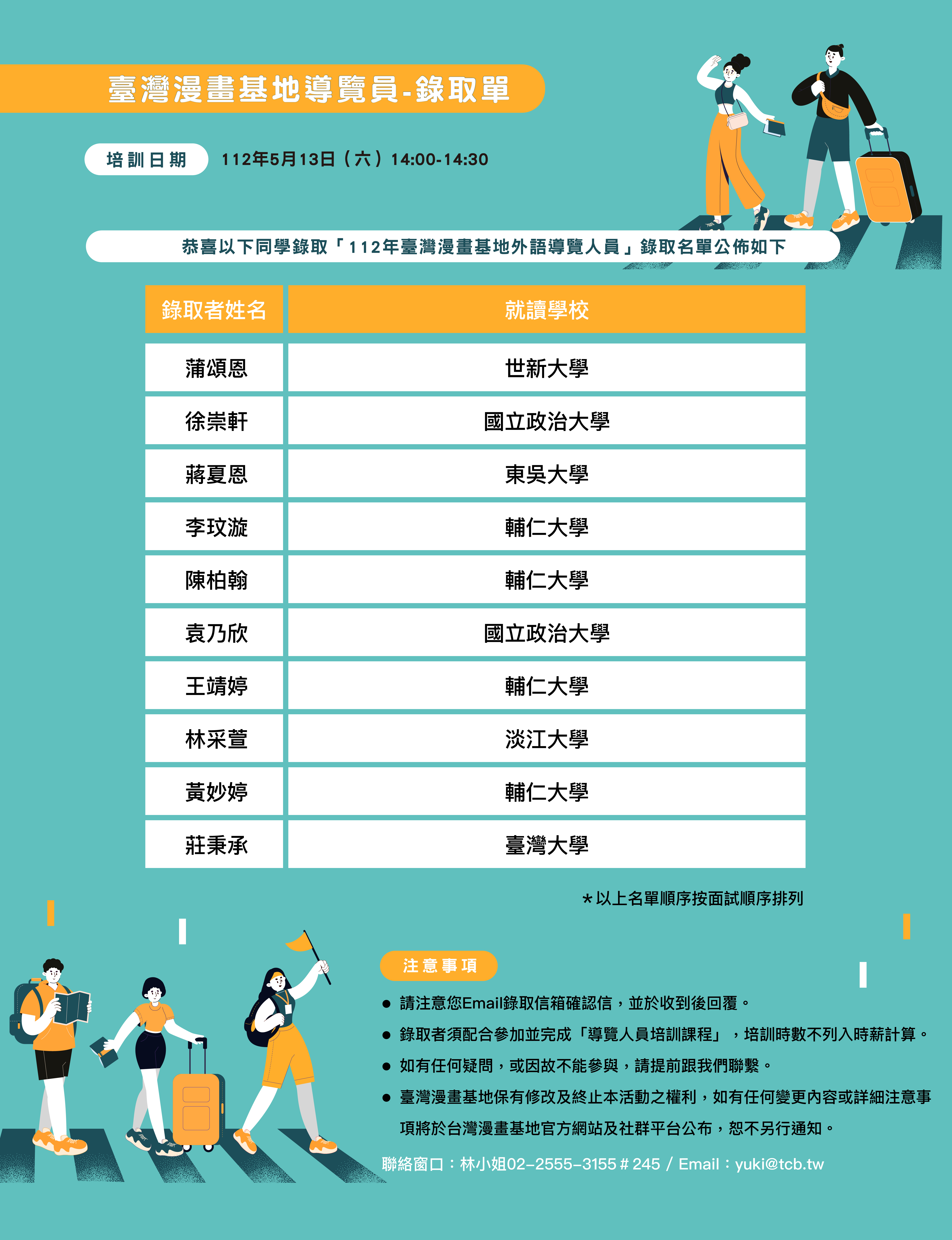【言途漫行】112年度臺灣漫畫基地-導覽人員招募計畫的錄取名單如下: