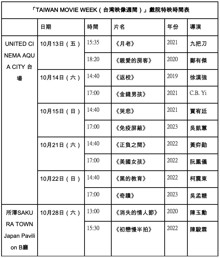 「Taiwan Movie Week(台湾映像週間)」實體戲院特映活動將於 10 月 13 日至 10 月 28 日期間,先後於「UNITED CINEMA AQUA CITY 台場」及「所澤 SAKURA TOWN」兩間戲院舉辦特映會。放映片單有 12 月即將在日本院線上映的《月老》(日文片名:《赤い糸 輪廻のひみつ》)、今年 8 月起在日本串流平台上架的 BL 劇《奇蹟》、改編自遊戲且在國內外獲得廣大迴響的電影《返校》、被日本知名編導宮藤官九郎欽點改編日版的原作《消失的情人節》等12部臺灣人氣影視作品。