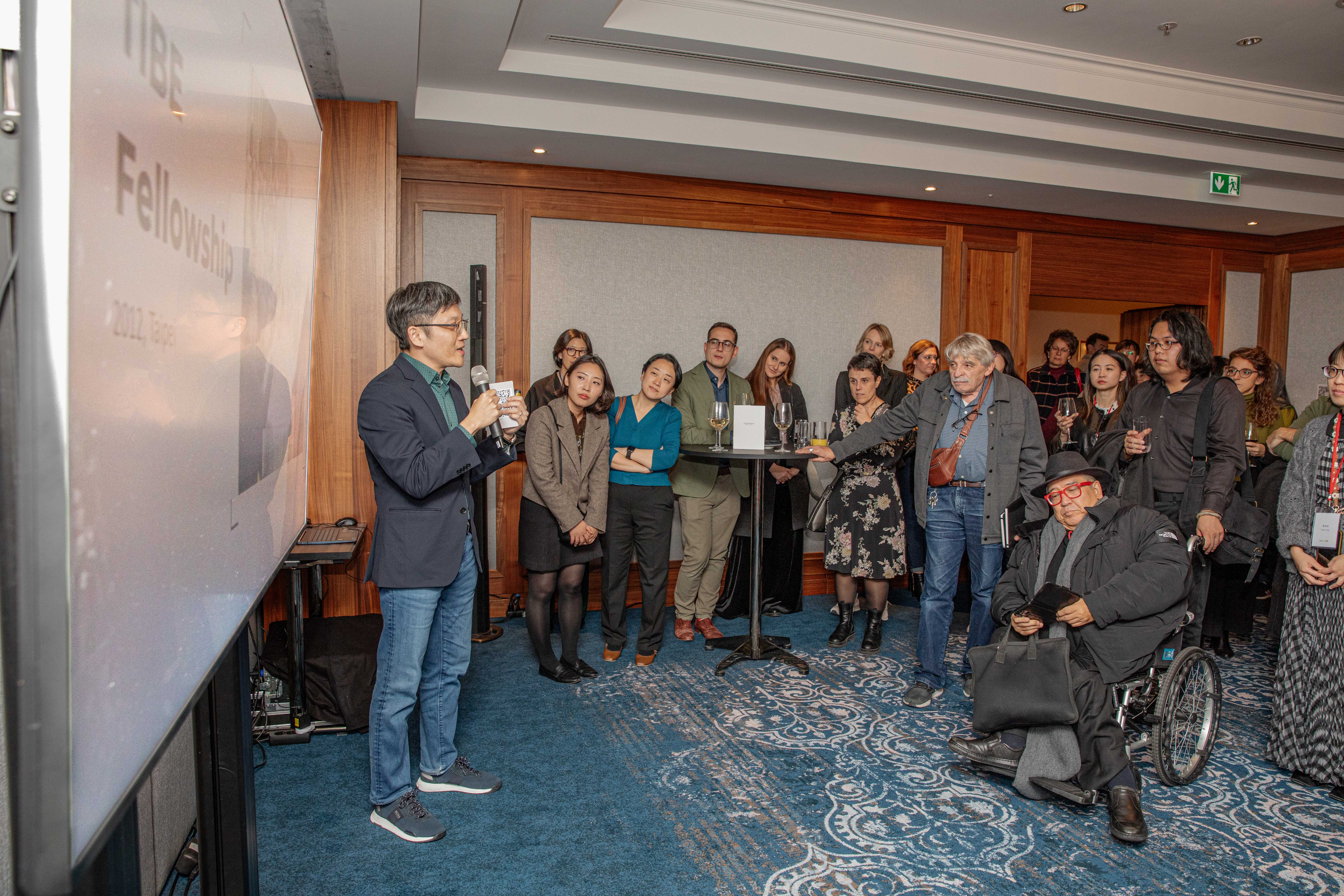 ▲文策院舉辦 Books From Taiwan 10 週年交流晚會,邀請曾與臺灣合作的海外出版社與國內業者一同參與,合作夥伴光磊國際版權公司創辦人譚光磊向海外出版社介紹歷年版權交流活動。(文策院/提供)