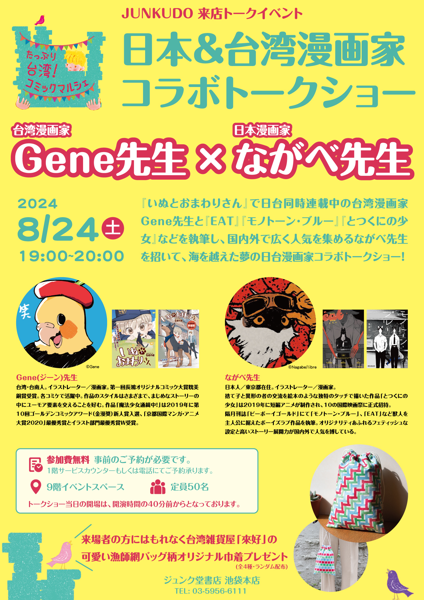 「滿滿台灣!漫畫市集」的實體活動將於 8 月 23 日至 9 月 8 日在「淳久堂書店池袋本店」、 8 月 24 日至 9 月 6 日在「Book 1st 新宿店」及「明文堂書店 TSUTAYA Lake Town」分別登場。書店內將設立專區,展示來自「Taiwan Comic City」的 33 部臺灣漫畫作品原稿,並提供日文版第一話的線上試閱,同時展售約 50 部日譯版臺灣漫畫,包括話題作品《微光的召喚師》系列,以及榮獲日本國際漫畫獎優秀獎的《貓與海的彼端》等作品。更有臺灣漫畫家 Gene、HOM 及筆頭老師以臺灣特色文化「市場」為靈感繪製的精彩插畫,現場也與「來好」、「京盛宇」、「洪瑞珍」等臺灣品牌合作推出活動贈禮及限定餐飲,讓日本讀者能感受漫畫魅力、體驗臺灣文化!8月24日,淳久堂書店池袋本店將特別舉辦臺日漫畫家座談會,邀請京都國際漫畫大賞雙冠得主、《犬系警探》漫畫家 Gene 與《EAT》、《無彩之藍》的日本漫畫家 ながべ,一同暢談漫畫創作的心路歷程。