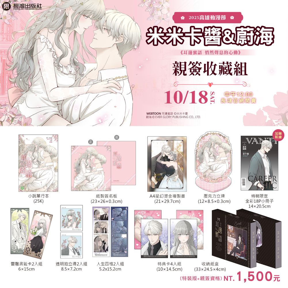 本屆高雄動漫節開展首日10月10日(五),長鴻出版社即邀請了《耳邊蜜語 悄然聲息的心動》的原作漫畫家米米卡醬老師,與擔綱小說改編的小說家蔚海老師舉辦聯合現場簽名會。原作漫畫《耳邊蜜語》在LINE WEBTOON平台上累積觀看人數高達26,800,000,長期霸榜愛情類作品冠軍,進軍日本後,在日本電子漫畫平台LINE MANGA上榮登女性人氣排行榜第一名,並拿下綜合排行榜第二名,成為首部登上該平台的台灣原創漫畫,國內外皆受到廣大讀者的喜愛與支持!