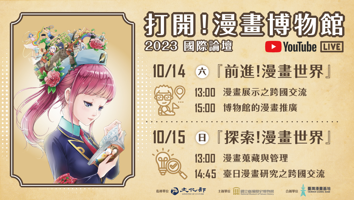 2023「臺灣租書店與漫畫的奇妙旅程」國際展於10月初於東京明治大學米澤嘉博紀念圖書館・現代漫畫圖書館開展,在展覽期間,將舉辦系列推廣活動,透過臺日本連線,向國際推廣臺灣漫畫作品、漫畫歷史與文化。國際論壇「打開!漫畫博物館」邀請臺日漫畫博物館和圖書館,一同探討漫畫博物館的各種面向。