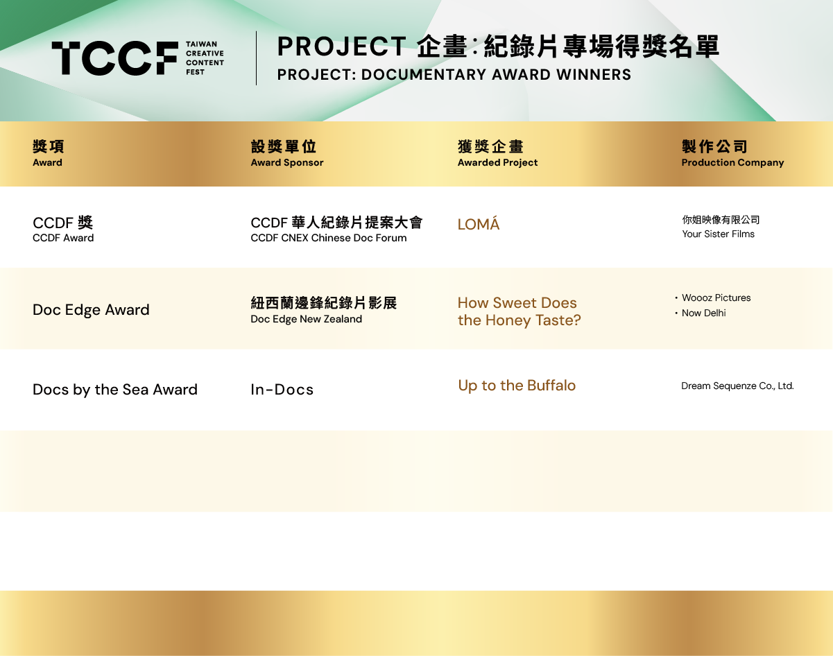 ▲2025 TCCF PITCHING提案大會_Project企劃:紀錄片專場得獎名單