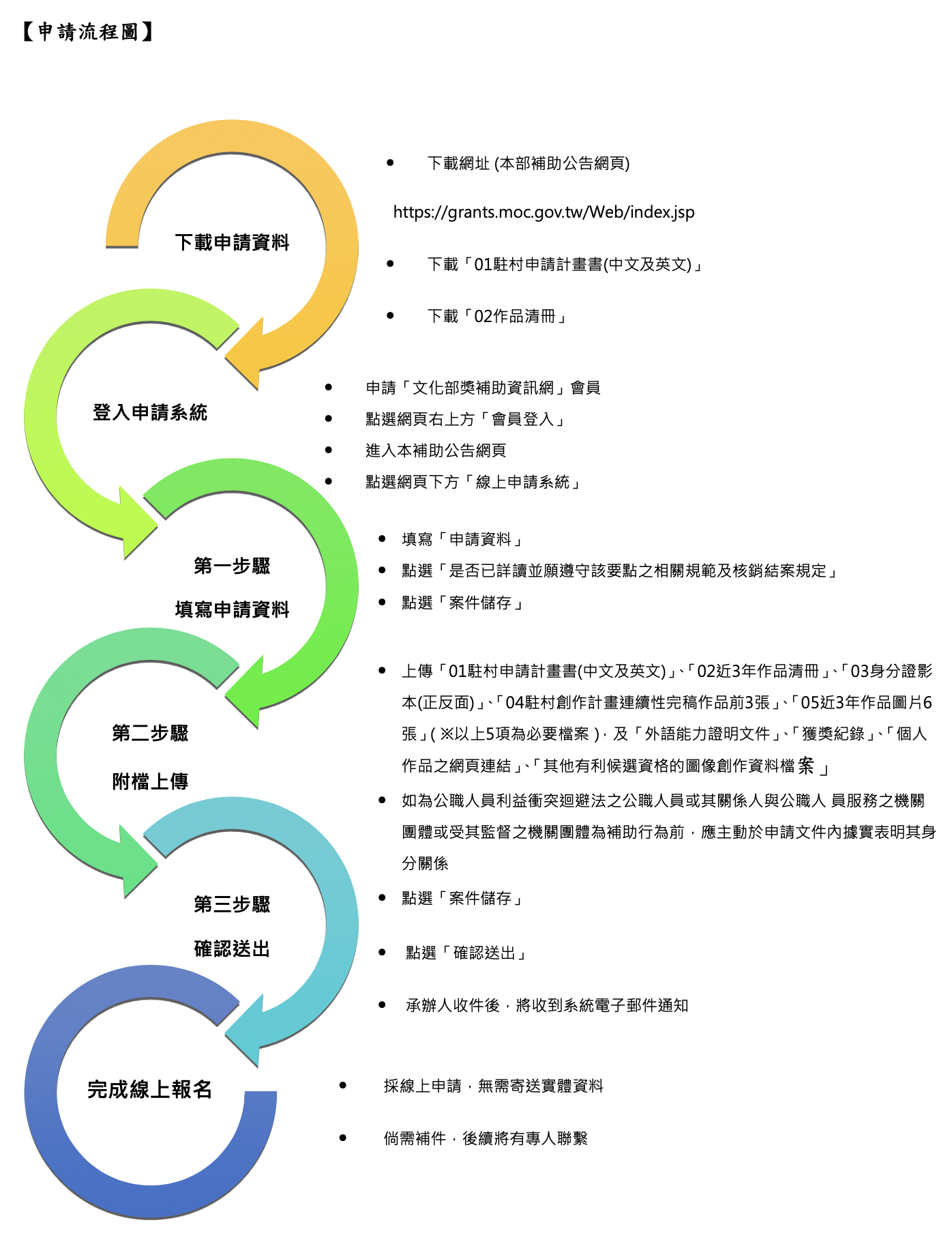 (二) 本案採線上申請方式辦理(文化部獎補助系統網址:https://grants.moc.gov.tw/Web),申請人應於公告申請期間至線上報名系統填寫、上傳相關申請資料。