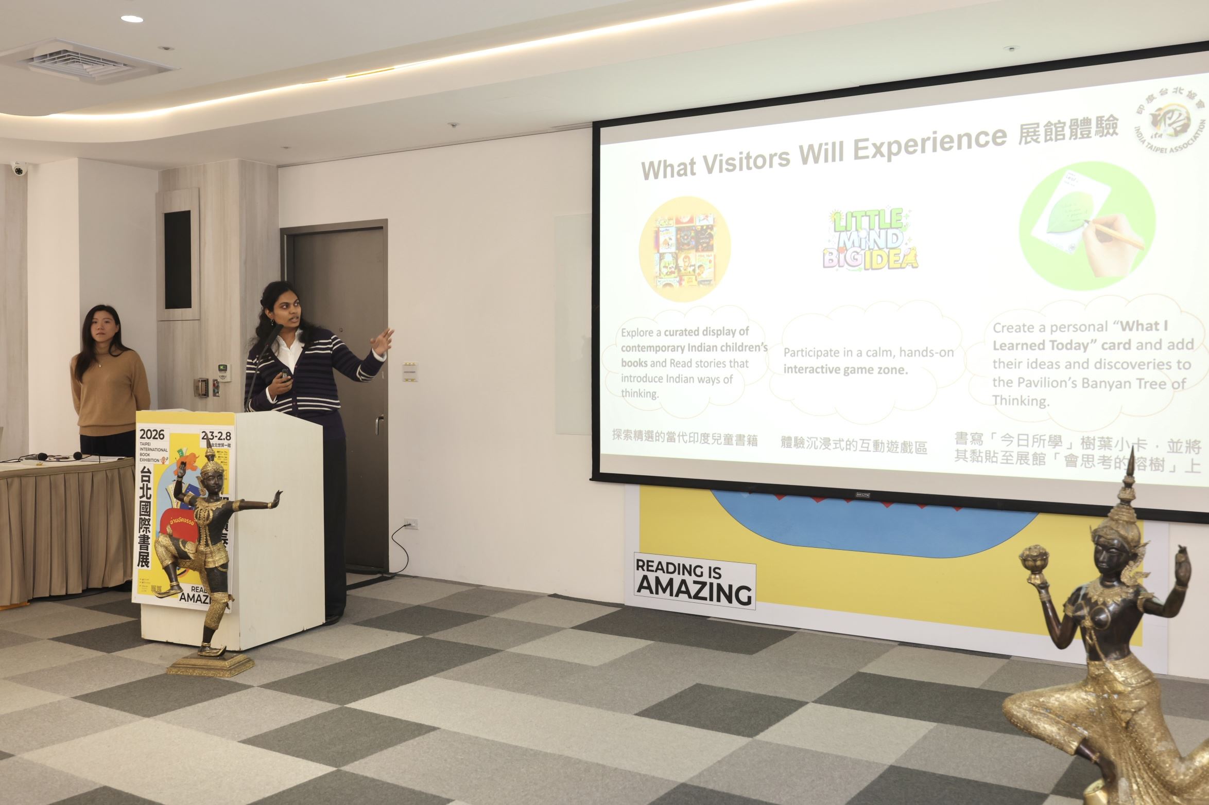 印度館由印度台北協會策畫,以「Little Mind, Big Idea」為主題,從孩子的視角出發,結合童書、互動螢幕與故事體驗,呈現印度多元文化、傳統寓言與多語社會的魅力;並以「故事」為核心,串聯閱讀、互動、藝術與文化思考,呈現印度文化在歷史深度與當代教育思維之間的多元樣貌。