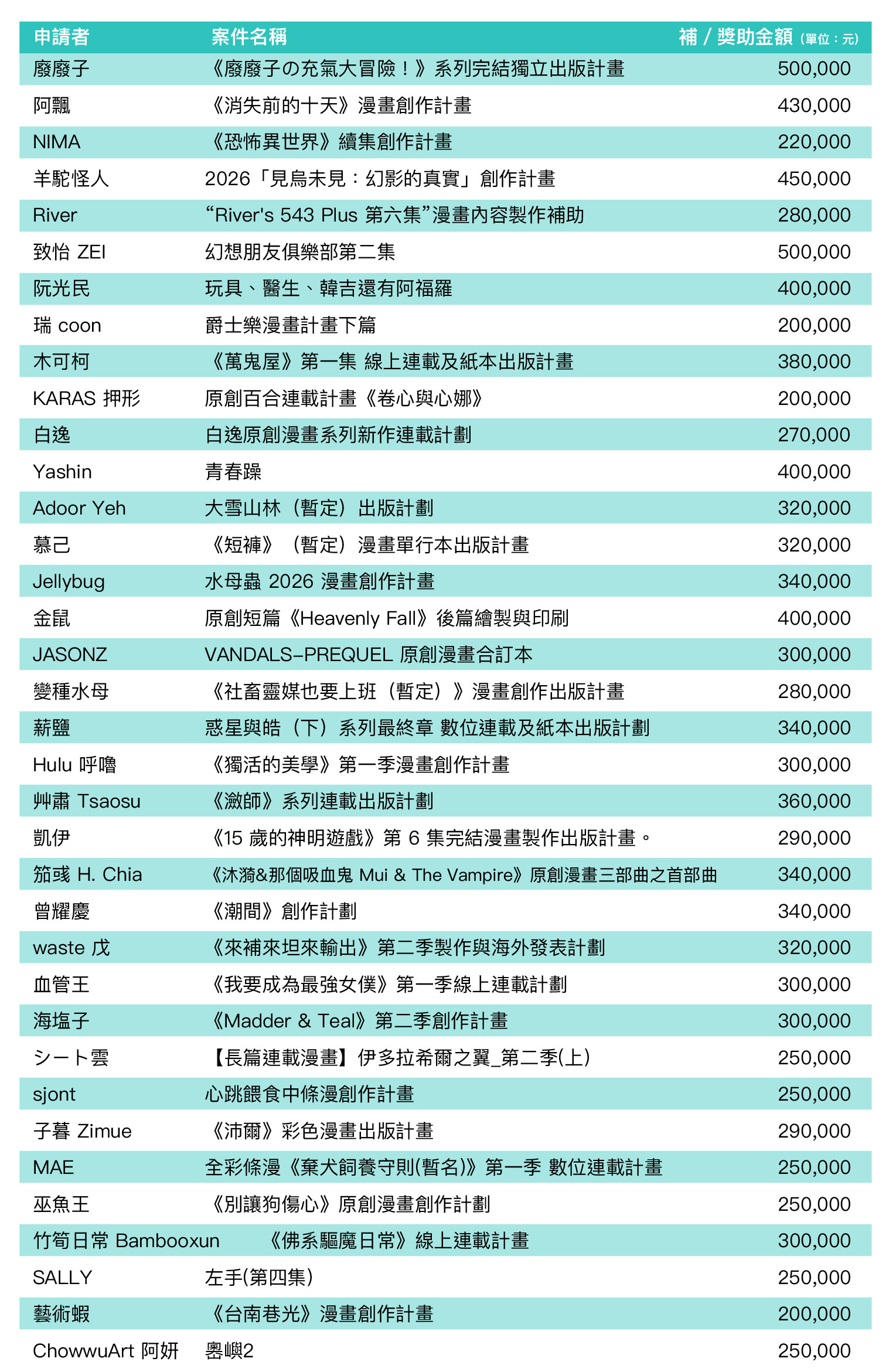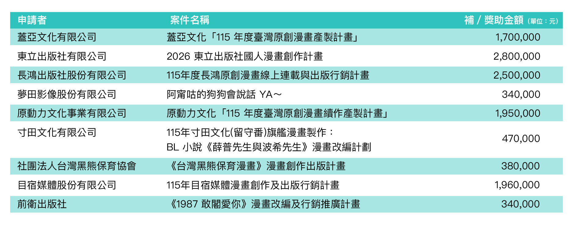 文化部2026年1月27日公布115年度「漫畫創作及出版行銷獎勵要點」獲獎勵名單。本次獲獎勵名單、獎勵金額及評審委員名單,可至文化部獎補助資訊網查詢。