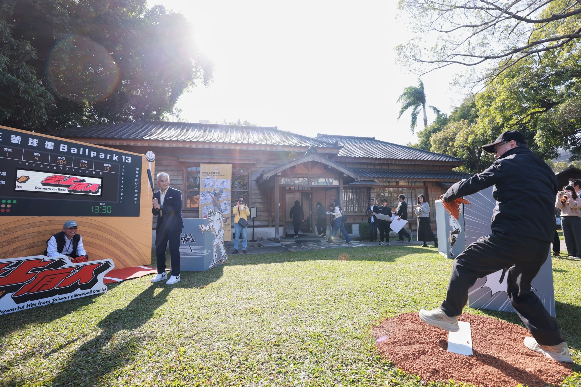 ▲文化部長李遠(右)為「壘上有人: 臺灣棒球漫畫的全力一擊」特展開幕儀式開球。