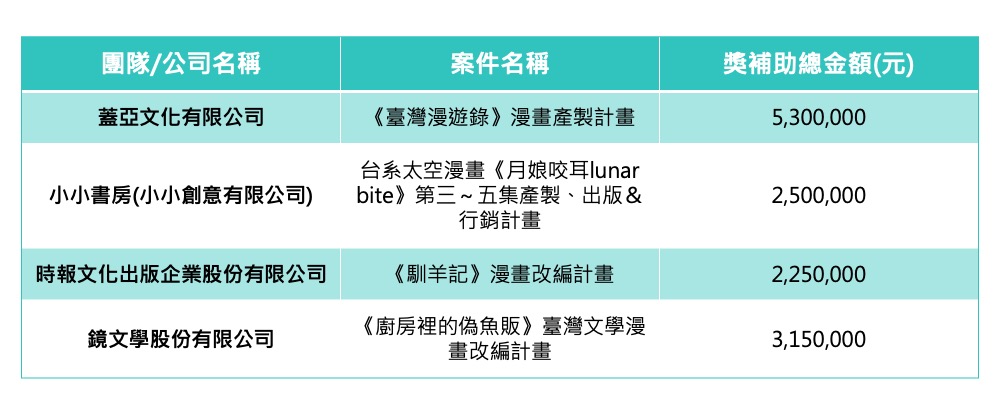 文化部2026年3月19日公布114年度「文化黑潮之T-Comics臺灣中長篇漫畫產製徵案要點」第二次徵件補助名單。