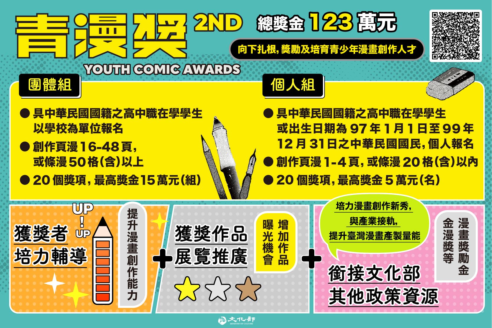 文化部今(2026)年辦理第2屆「青漫獎」,即日起至10月2日受理報名,獎項分為個人組及團體組,總獎金新臺幣123萬元,歡迎全國高中職學生及青少年踴躍參賽。文化部表示,期待藉由青漫獎及系列課程、活動的辦理,鼓勵更多青少年接觸臺灣原創漫畫,並發掘具潛力的新秀投入創作,持續提升臺灣漫畫創作能量。