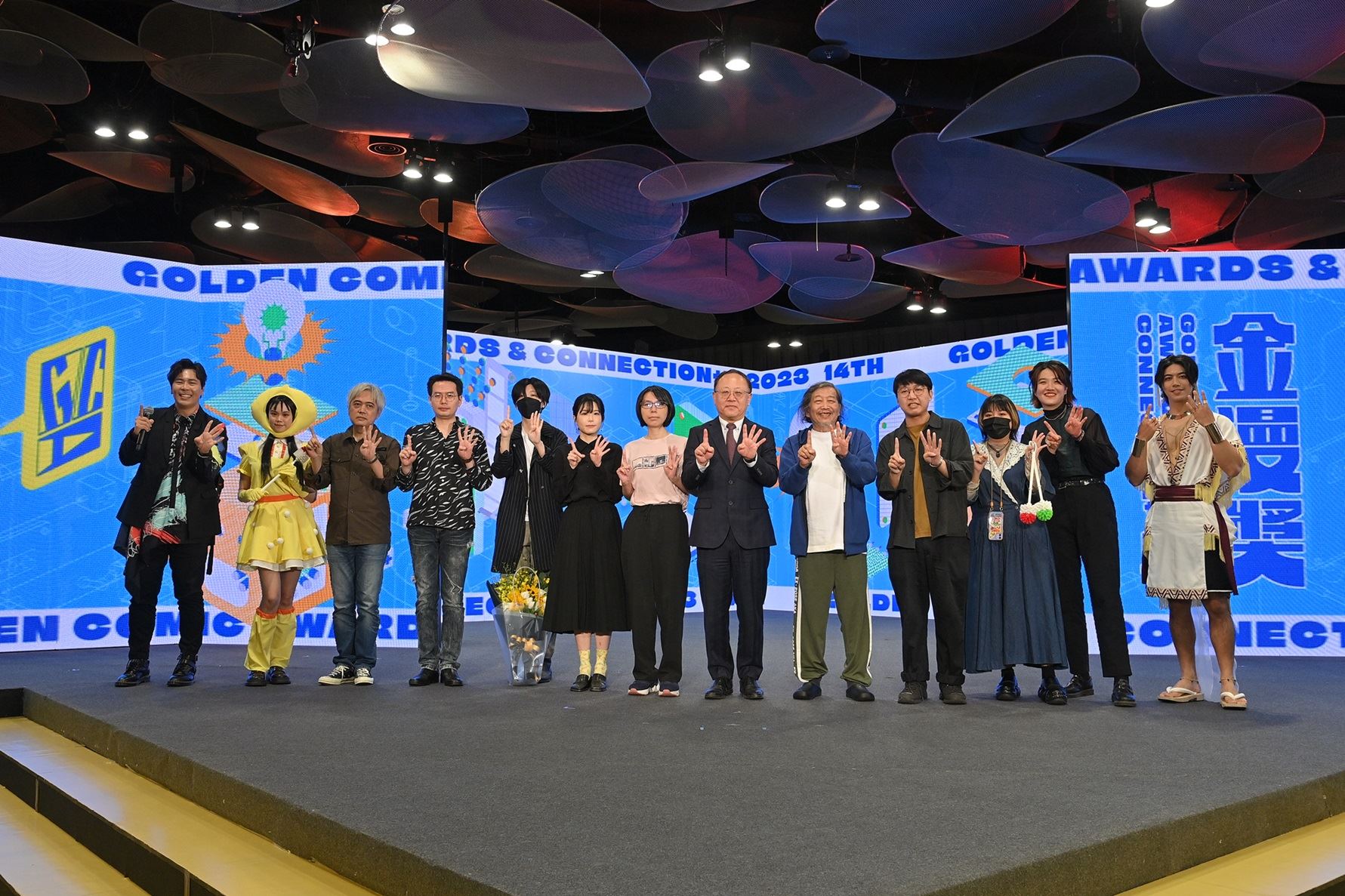 ▲文化部長史哲(右7)與第14屆金漫獎獲獎者等合影,並感謝創作者們關心這塊土地的一切,常以臺灣的議題出發,以歷史、在地傳說故事、性別議題、音樂、生活等面向創作,呈現如此豐富多元的面貌。