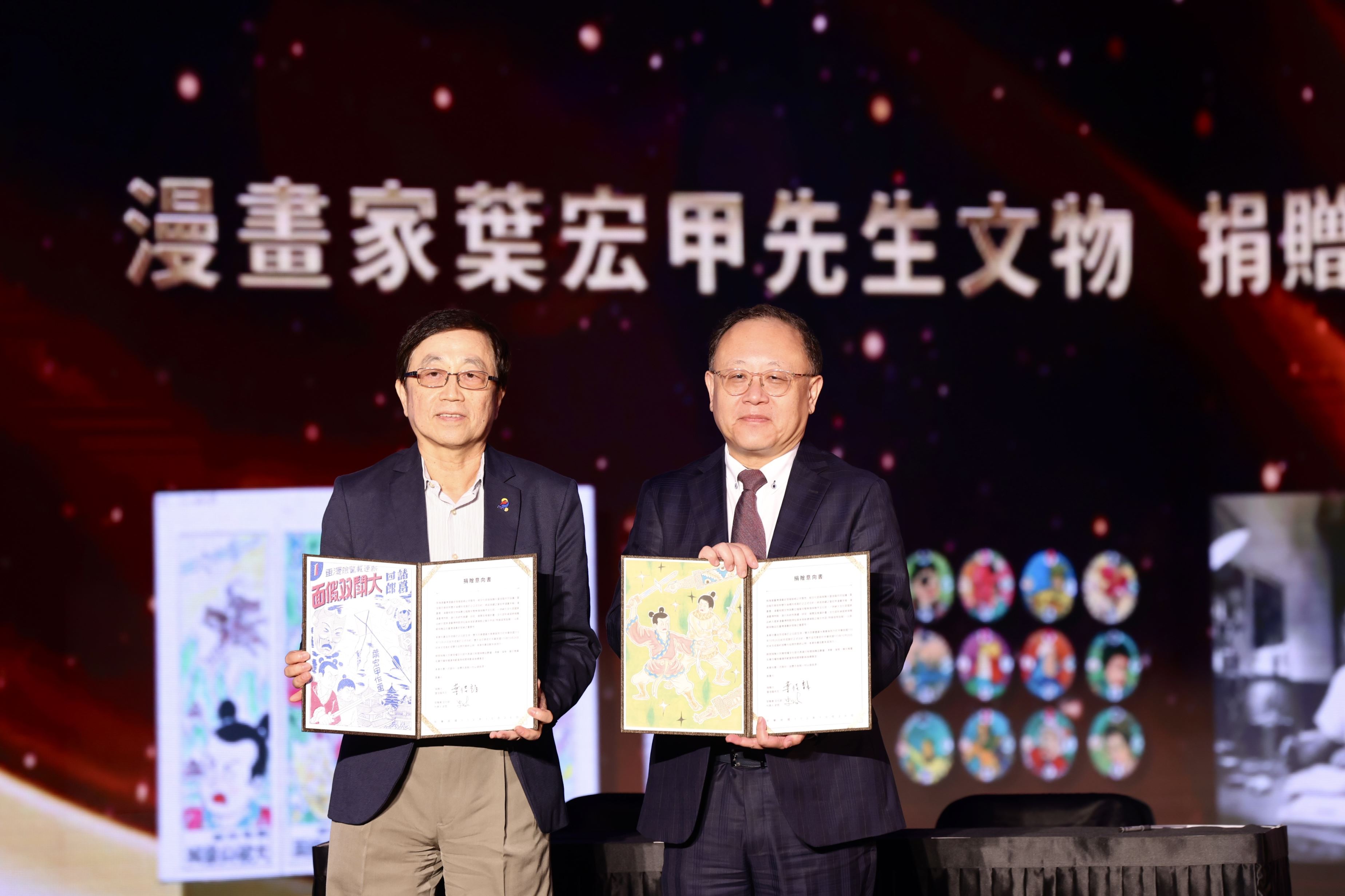 ▲漫畫家葉宏甲之子葉佳龍(左)將父親的作品手稿、漫畫書、相關文物及數位檔案慷慨捐贈給文化部,今(26)日於第14屆金漫獎頒獎典禮上與文化部長史哲共同簽署文物捐贈意向書。