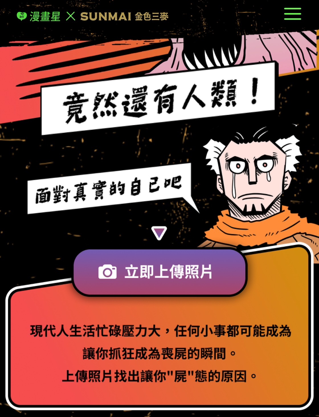 橘子集團旗下漫畫星作品《食屍鬼》歡慶連載二周年,推出「這裡拍拍~屍麥唷:)」人臉AI分析,民眾只要上傳照片,AI技術讓人一鍵變身漫畫《食屍鬼》中的喪屍角色,解析民眾壓力大露「屍態」的原因。活動一推出,知名藝人關韶文、Youtuber漫才團體「面白大丈夫」響應變喪屍,網友大讚分析結果「台北好屍 雨和眼淚拚命落下:)」「過敏用屍屍 哈啾哈啾皮卡邱邱:)」超符合現在台北陰雨連天時事,解方幽默具創意!現在玩AI分析還可獲得免費SUNMAI金色三麥啤酒兌換券,邀請民眾加入這場屍樂園!
